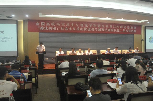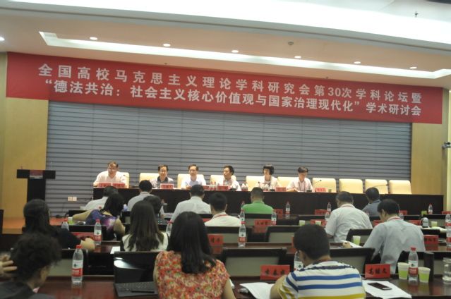 大会由三个主题报告和四组会议发言组成,与会者围绕德治与法治的理论涵义及其内在关联、德法共治与社会主义核心价值观、国家治理现代化、执政党建设和高校思想政治教育建设等主题进行了深入的理论探讨。