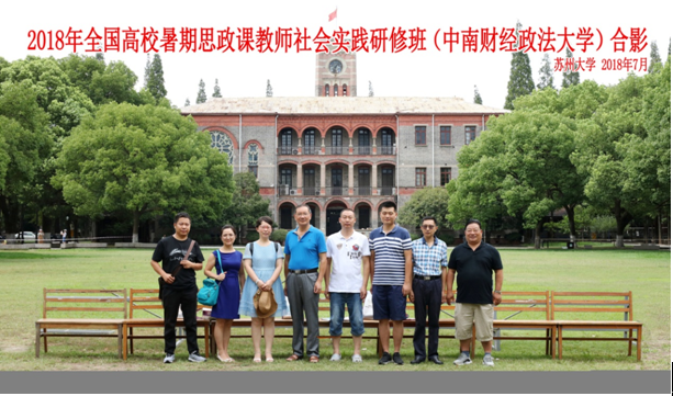 (通讯员:付佳迪)为深入学习贯彻习近平新时代中国特色社会主义思想和党的十九大精神,深入贯彻落实全国高校思想政治工作会议和中共中央、国务院关于加强和改进新形势下高校思想政治工作的意见精神,积极响应《教育部办公厅关于2018年暑期组织高校思想政治理论课骨干教师社会实践研修的通知》,继续打好提高高校思政课质量和水平的攻坚战,使广大思政课教师牢固树立“四个意识”,坚定“四个自信”,2018年7月23日至29日,马克思主义学院中国化马克思主义教研部一行八人在何萍主任带队下,赴苏州大学参加2018年全国高校暑期思政课教师社会实践研修班。