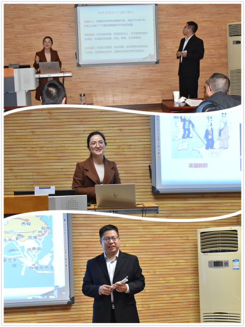 本次集体备课通过双师示范课堂展示的形式开展,四组教师分别根据其学科特点,借助智慧课堂,面向8名教师评委和20名学生开展展示教学。中国近现代史纲要教研部的姚桂荣和刘海波从文化角度和经济角度阐述了当前学界对鸦片战争爆发原因的两种观点,并对这两种观点的偏颇进行了分析,最后指出鸦片战争的根本原因是资本主义的侵略本性;中国化马克思主义教研部的柳红霞和张瑞堂以“一带一路开启全面开放新格局”为主题,运用风趣幽默的语言从“是什么、做什么、意义何在”三方面详细阐述了“一带一路”的有关内容,同时留下课后思考题引发思考;思想道德修养与法律基础教研部的夏澍耘和徐春艳以“人的本质”为主题,用四个案例由浅入深地阐述了不同层面的人的本质的内涵,并强调了理解掌握“人的本质是什么”的重要性;马克思主义基本原理教研部的王梅清结合中美贸易战等时事热点和生活实例阐述了矛盾的观点,强调矛盾既对立又统一,要辩证看待矛盾的同一性与斗争性的关系以及这二者在事物发展中的作用。