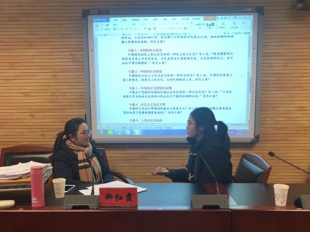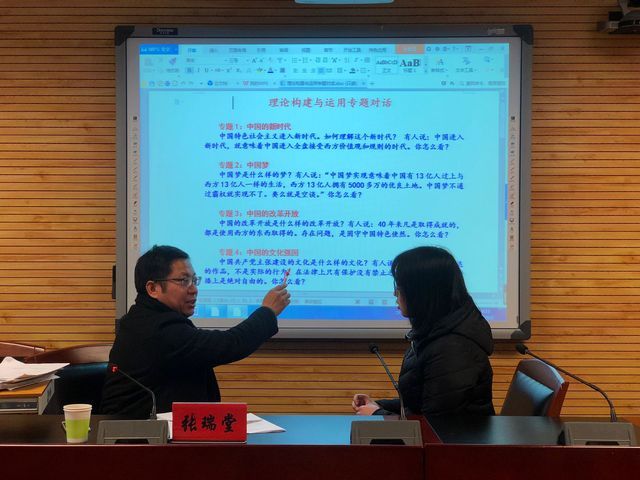 2019年1月2日,在文沛楼马克思主义学院的思想政治教学实验室里,由张瑞堂和柳红霞老师承担的双师示范课堂的42名学生观摩了一场特殊的“对话”:“理论构建与运用”的师生对话。截止1月6日,在思政课“综合创新实验课堂”学习的440名学生也与主讲教师进行了多种形式的“理论构建与运用”对话,最终90%以上学生获得了习近平新时代中国特色社会主义思想专题学习的优秀成绩。