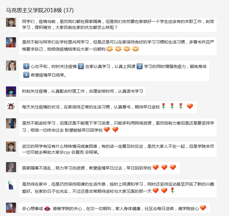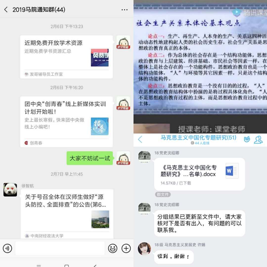 中国化马克思主义教研部张瑞堂老师在新冠肺炎疫情防控战疫打响后,第一时间为每一个课堂组建学习群,将党和政府领导的人民抗疫战争同思政课结合起来,随时审视网络言论,坚持用马克思主义的立场、观点和方法,纠偏扶正,积极引导学生,避免被恶意舆论或者偏激言论、偏私言论裹挟。形势与政策教研部主任曾宪洪老师积极响应学院安排,在线上开展思政课教学,结合“00后”话语体系深入浅出地为大学生分析中国在当今世界面临的机遇与挑战,深得学生喜爱。有网名“holdfirmto”在线上表示:“线上第一天网课的怨声载道,到第四天爱上网课,并从曾老师的课堂上悟出要善于发现生活的小美好,以及提升个人魅力和幽默的重要性。”马院教师努力联通社会大课堂和教学小课堂,认真践行思政课教师的初心和使命,坚持战“疫”育人,传递抗疫正能量。