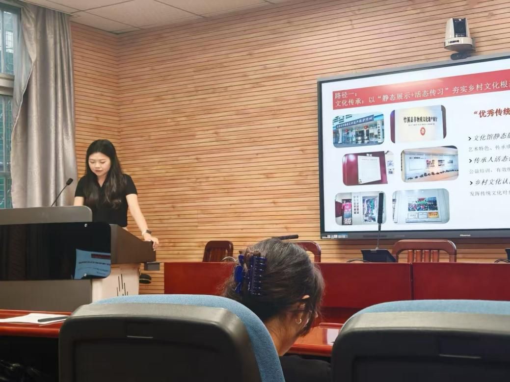 李小雨同学分享了题为《“第二个结合”视域下传统戏曲创新传承与乡村文化振兴——基于竹溪县国家级非遗“山二黄”的创新实践研究》的调研成果。汇报从文化传承、艺术创新、文旅融合三个维度,生动阐述了传统戏曲助力乡村文化振兴的创新实践。