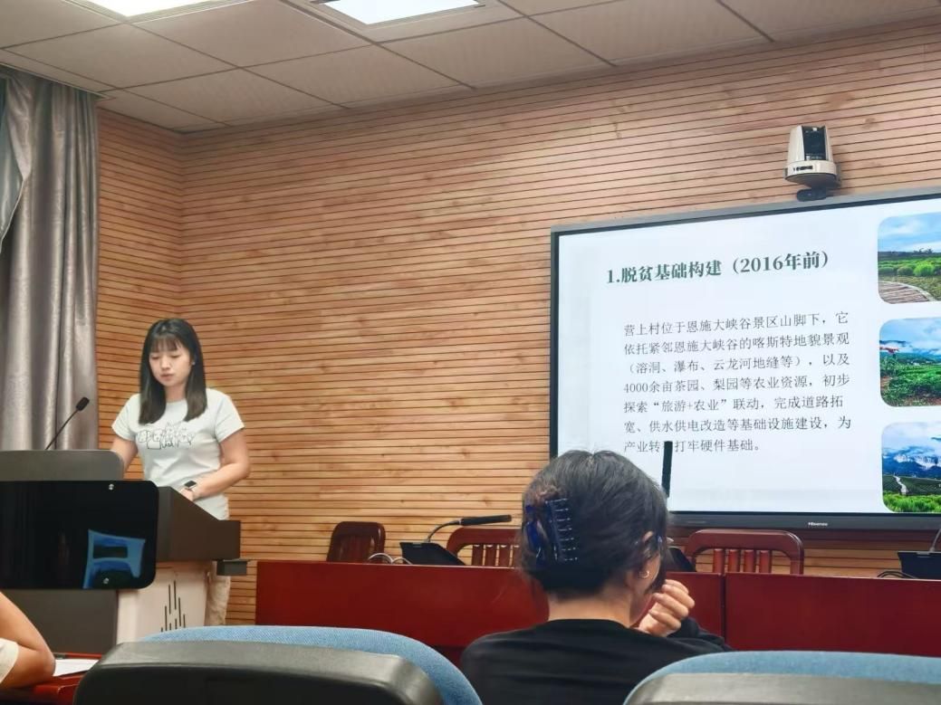 谭梓怡同学以《恩施营上村文旅融合赋能乡村振兴的路径研究》为题,运用马克思主义基本原理分析了营上村从昔日山区贫困村到如今旅游特色村的“蜕变之路”,论证了农文旅融合作为乡村振兴有效路径的科学性与可行性。