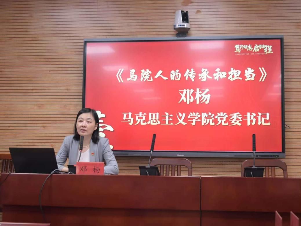 党委书记邓杨聚焦“马院人的传承和担当”,带领新生们回顾了学院深厚的红色血脉,介绍了在红色基因浸润下的学院建设步履铿锵,科研成果丰硕,平台资源优质。她寄语学子们:“作为新时代马院人,当赓续红色基因,以学术报国、实践为民,让青春在南湖启航。”