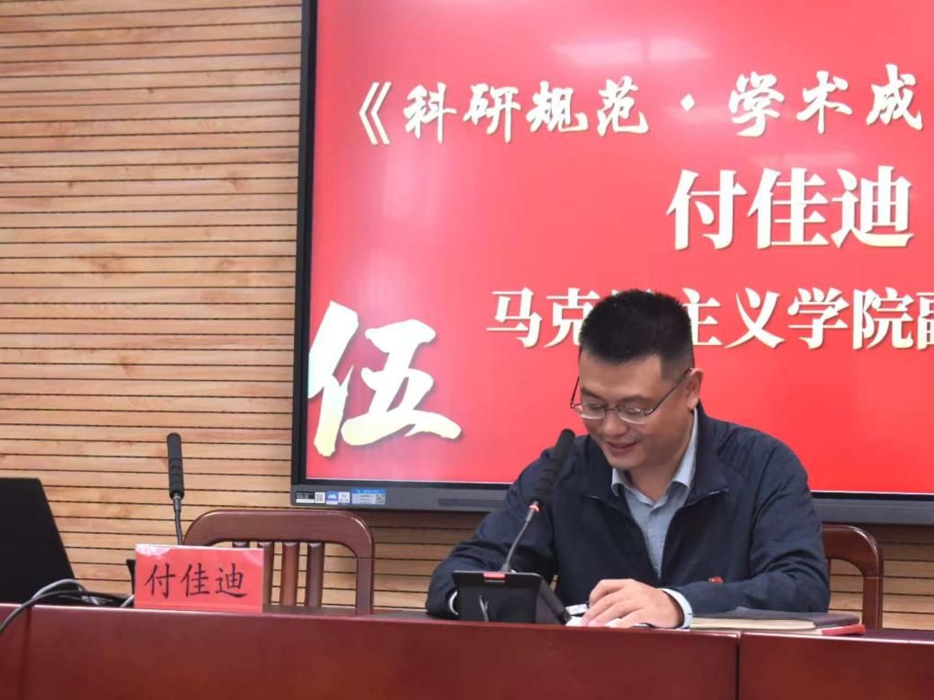 副院长付佳迪聚焦科研规范与学术道德。他指出在当前科技竞争日益激烈的背景下,我国面临原始创新能力不足的挑战,更需筑牢学术道德防线,杜绝学术不端行为。此外,他结合相关案例警示学术失范危害,鼓励同学们甘坐“冷板凳”,将学术追求与国家战略需求紧密结合,在遵守规范中实现真正创新,为繁荣发展哲学社会科学贡献力量。