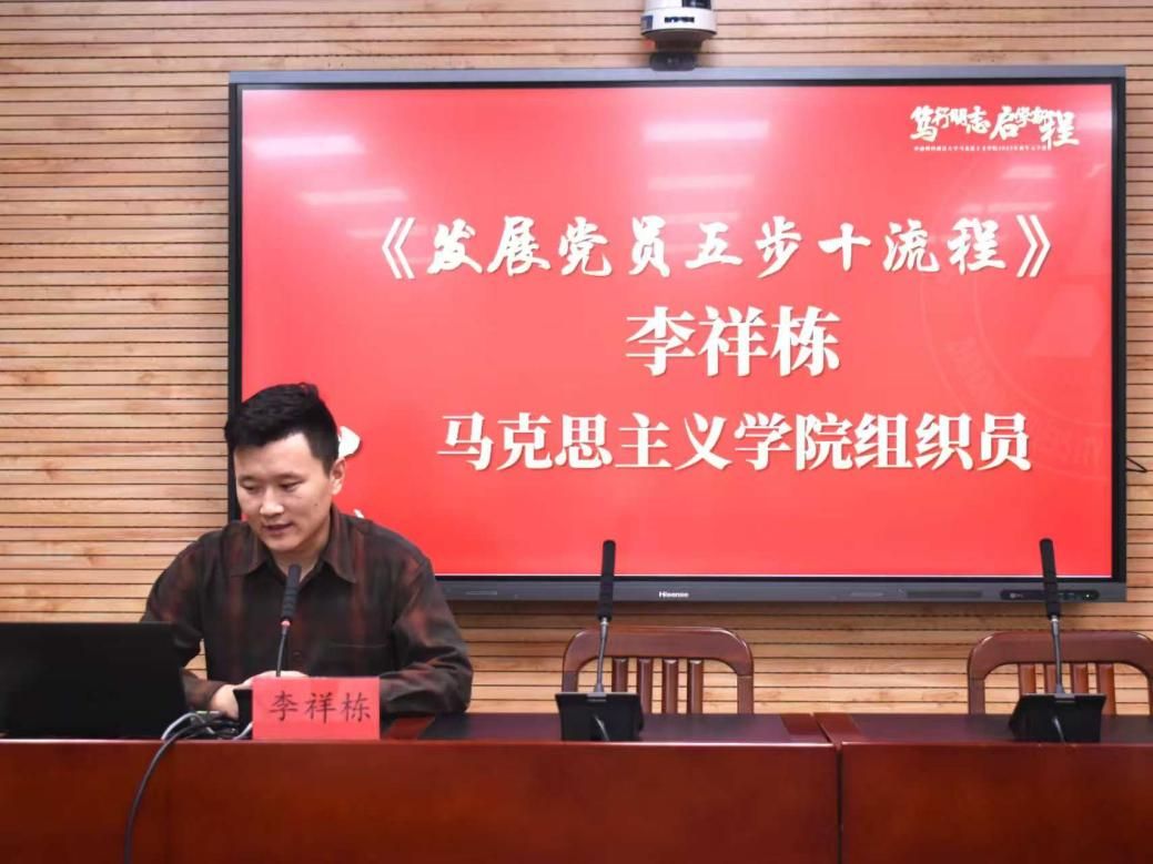 组织员李祥栋围绕“五步十流程”详细介绍了发展党员的相关内容。他强调,入党过程不仅是程序步骤,更是党性锤炼与责任担当的生动实践,政治标准是首要标准。他希望同学们在学术科研、社会实践、服务师生等各方面追求卓越,争当表率,将个人成长融入党和国家事业发展大局。