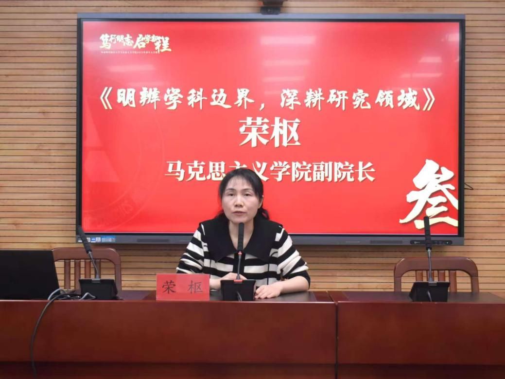 副院长荣枢就学科规范与研究边界作专题讲解,并结合马克思主义理论一级学科及二级学科特点,分析各领域核心研究方向与差异。她强调,论文选题应立足学科本体,鼓励同学们在把握专业特色的基础上促进学科交叉,实现研究创新。