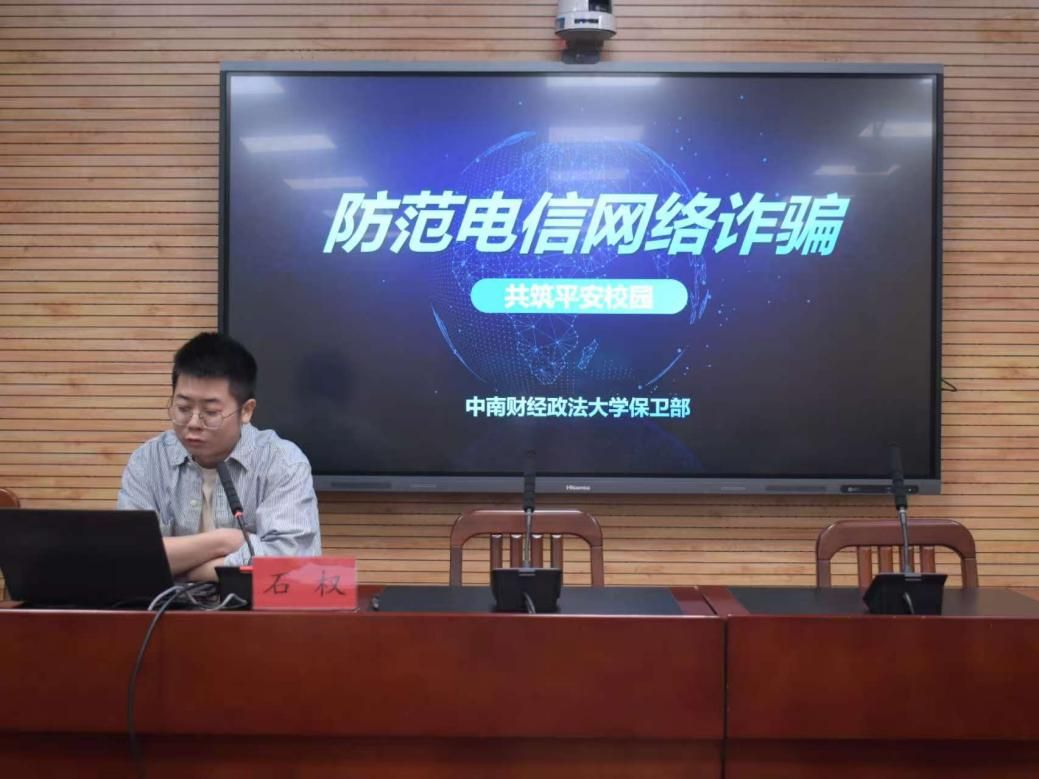校保卫部石权老师开展反诈专题培训,指出当前电信网络诈骗呈现集团化、跨境化及精准化特点,师生需高度警惕。他结合真实案例,剖析常见诈骗手法,并提醒同学们增强防范意识,共同筑牢校园反诈“防火墙”。