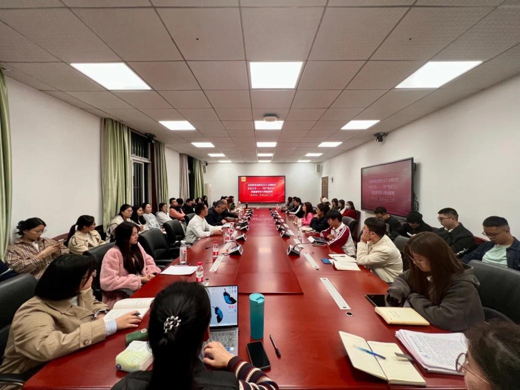 (通讯员 简浩 摄影 余卿卿)为深入开展学习贯彻习近平新时代中国特色社会主义思想主题教育,认真领会习近平总书记在党史学习教育动员大会上的重要讲话精神,扎实推进党史学习教育常态化、长效化,努力营造书香马院的浓厚氛围,10月31日晚,马克思主义学院、社会主义核心价值观研究中心在文沛楼402会议室举办了“读懂中国·红色马院”系列讲坛暨2025年第九期“读懂马克思”系列读书交流会。本次读书会以《共产党宣言》为文本,特邀湖南大学马克思主义学院曲达副教授主讲,中南财经政法大学马克思主义学院教师龚先庆主持,我院教师陈兴耀及2025级硕士研究生共同参加学习。