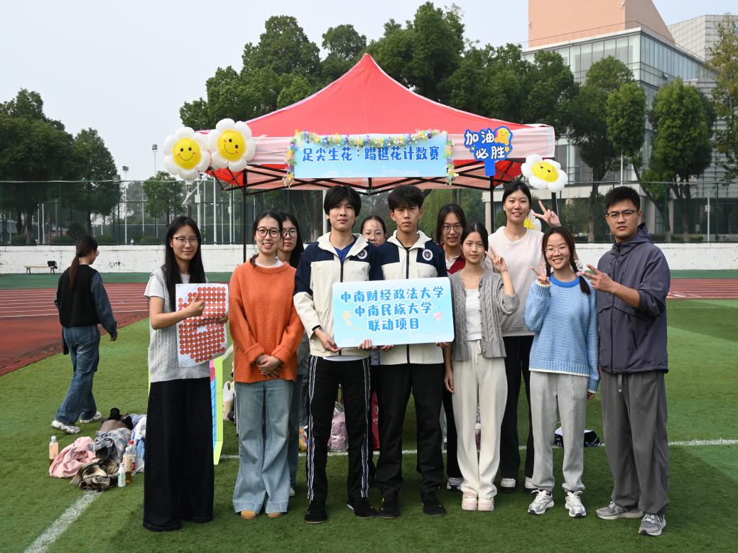 (通讯员:钱丹丹 摄影:汪馨月)秋阳暖照,活力迸发,燃动青春,健康无限。11月2日上午,中南财经政法大学在南湖校区环湖操场举行“青研杯”研究生运动嘉年华活动。本次活动由中南财经政法大学党委研究生工作部、中南财经政法大学研究生团工委、中南财经政法大学研究生会、中南财经政法大学研究生艺术美育中心主办,各院研究生会参与。马克思主义学院积极响应研工部号召,联合中南民族大学的校外指导人员,在活动中承办了“足尖生花:踢毽花计数赛”趣味项目,此项目成为本次嘉年华活动中一道亮丽风景。