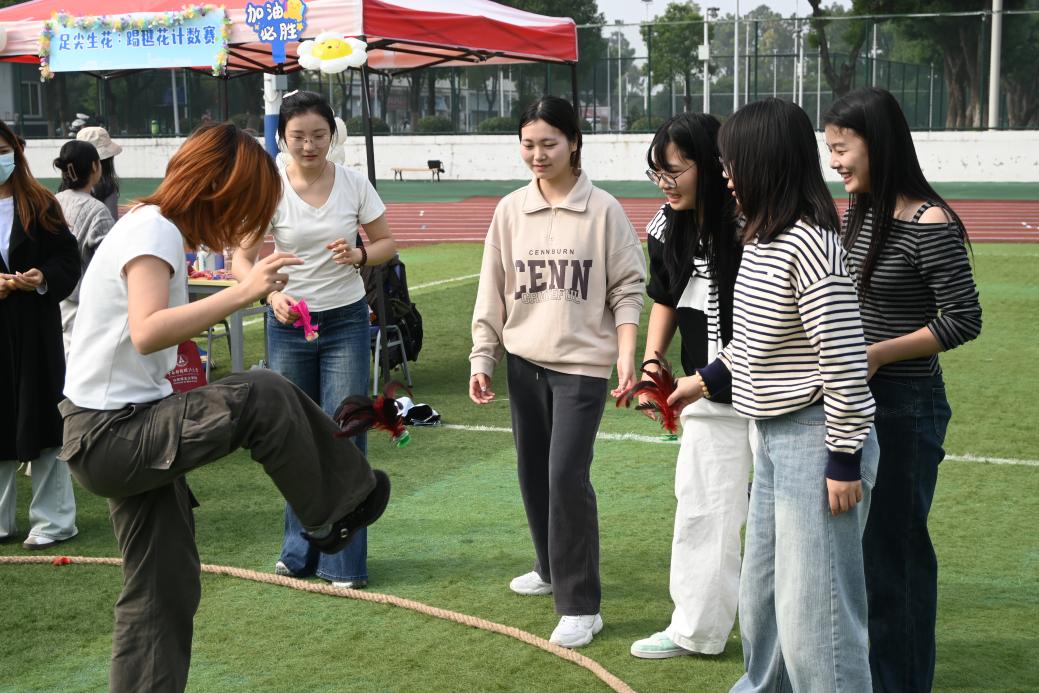 作为本次运动嘉年华十五大趣味闯关项目之一,由马克思主义学院主要负责的“足尖生花:踢毽花计数赛”项目吸引了大量跨院系研究生组队参与。该项目不仅保留了传统踢毽子的技巧性与趣味性,更融入了团队接力、计数挑战等创新规则,既考验个人身体协调性,又强调团队默契配合。五彩的毽子在同学们灵活的脚踝间轻盈起落,划出一道道青春弧线,现场欢笑声、计数声、喝彩声不绝于耳。