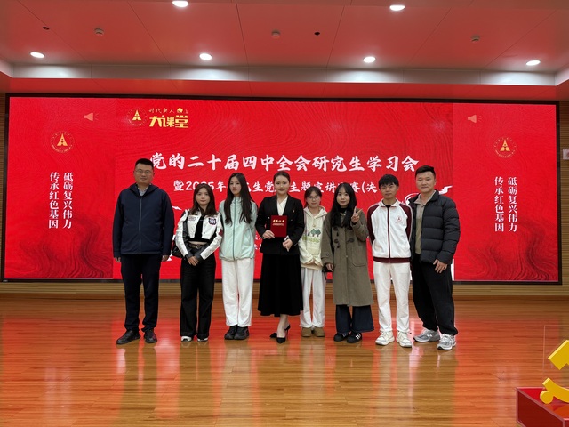 (通讯员 陈梦娟 摄影 冯佳琪 吴嘉)为深入学习贯彻党的二十届四中全会精神,体现“发展具有强大思想引领力、精神凝聚力、价值感召力、国际影响力的新时代中国特色社会主义文化”部署要求,激励广大研究生从党的奋斗历程中汲取历史主动精神,在中国式现代化建设新征程中挺膺担当,10月30日下午,由党委研究生工作部主办,校研究生会、研究生宣讲团承办的研究生党史故事宣讲比赛决赛于文澴楼同声传译会议室成功举办。党委研究生工作部部长张文剑、党委组织部副部长屈代洲、党委宣传部副部长朱诚蕾、党委研究生工作部副部长李芳、机关党委副书记刘进明、团委副书记林晶晶、马克思主义学院副院长付佳迪受邀担任评委。