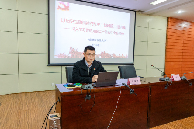 此次报告会邀请学习贯彻党的二十届四中全会精神武昌区委宣讲团成员、中南财经政法大学马克思主义学院副院长、副教授付佳迪作专题辅导。付教授以《以历史主动精神克难关、战风险、迎挑战——深入学习贯彻党的二十届四中全会精神》为主题,围绕习近平总书记在党的二十届四中全会上的重要讲话精神和《中共中央关于制定国民经济和社会发展第十五个五年规划的建议》,从英雄的城市、英雄的人民的突出特点、光辉历程、精神启示三个方面,为全体党员干部学习贯彻全会精神作出了生动而深刻的辅导。