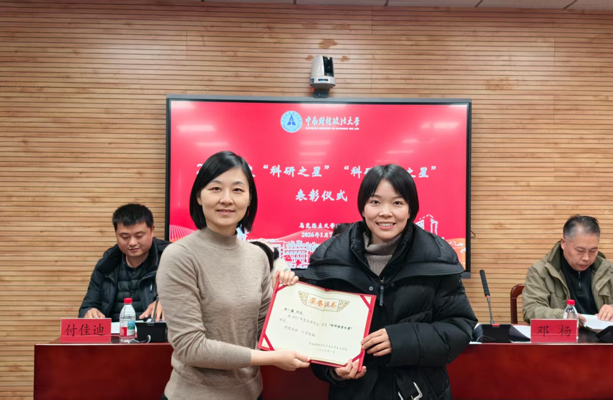 大会对学院“科研之星”进行了表彰。荣枢老师获评马克思主义学院2025年度“科研之星”称号。金一鑫老师、孙明扬老师获评马克思主义学院2025年度“科研培育之星”称号。