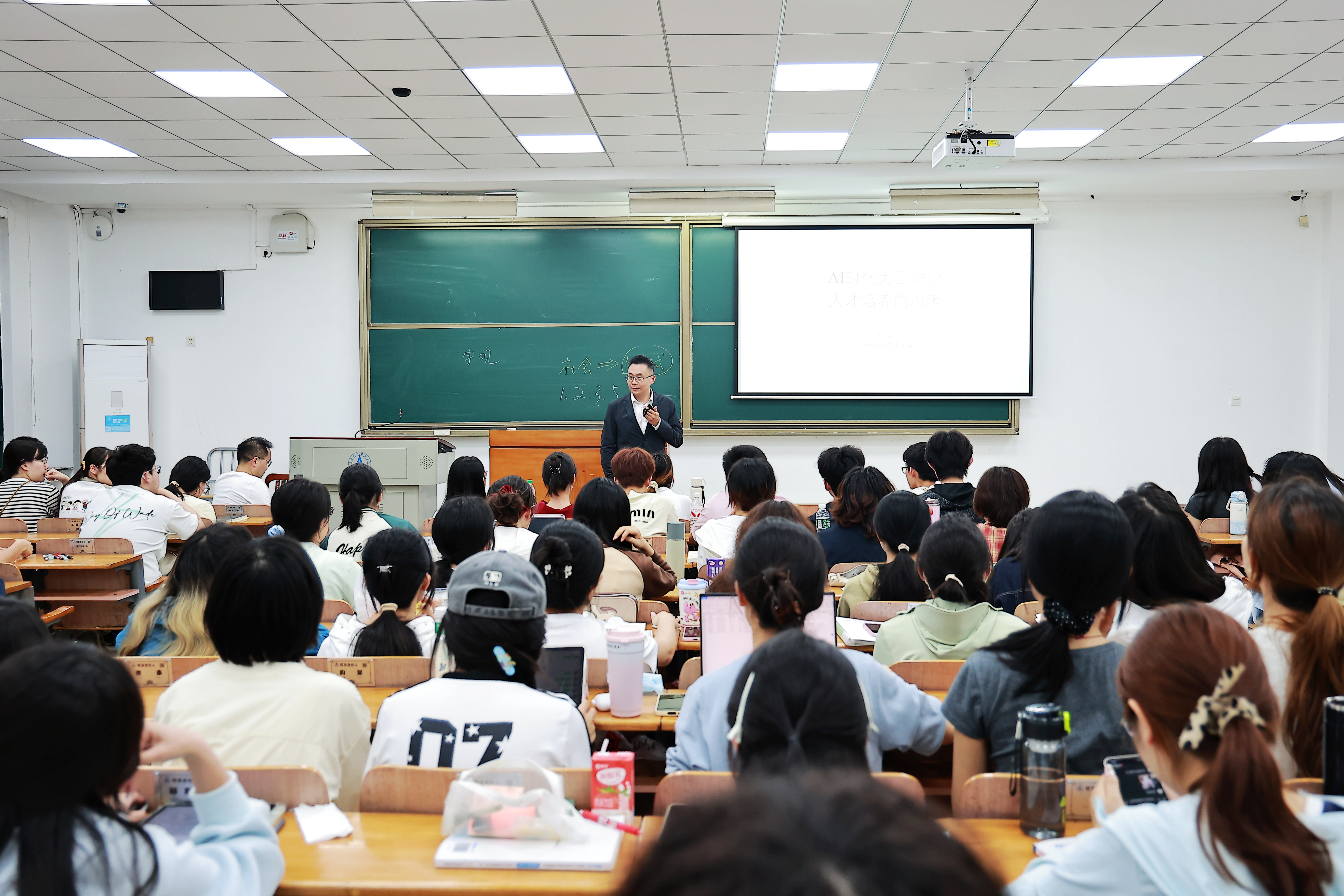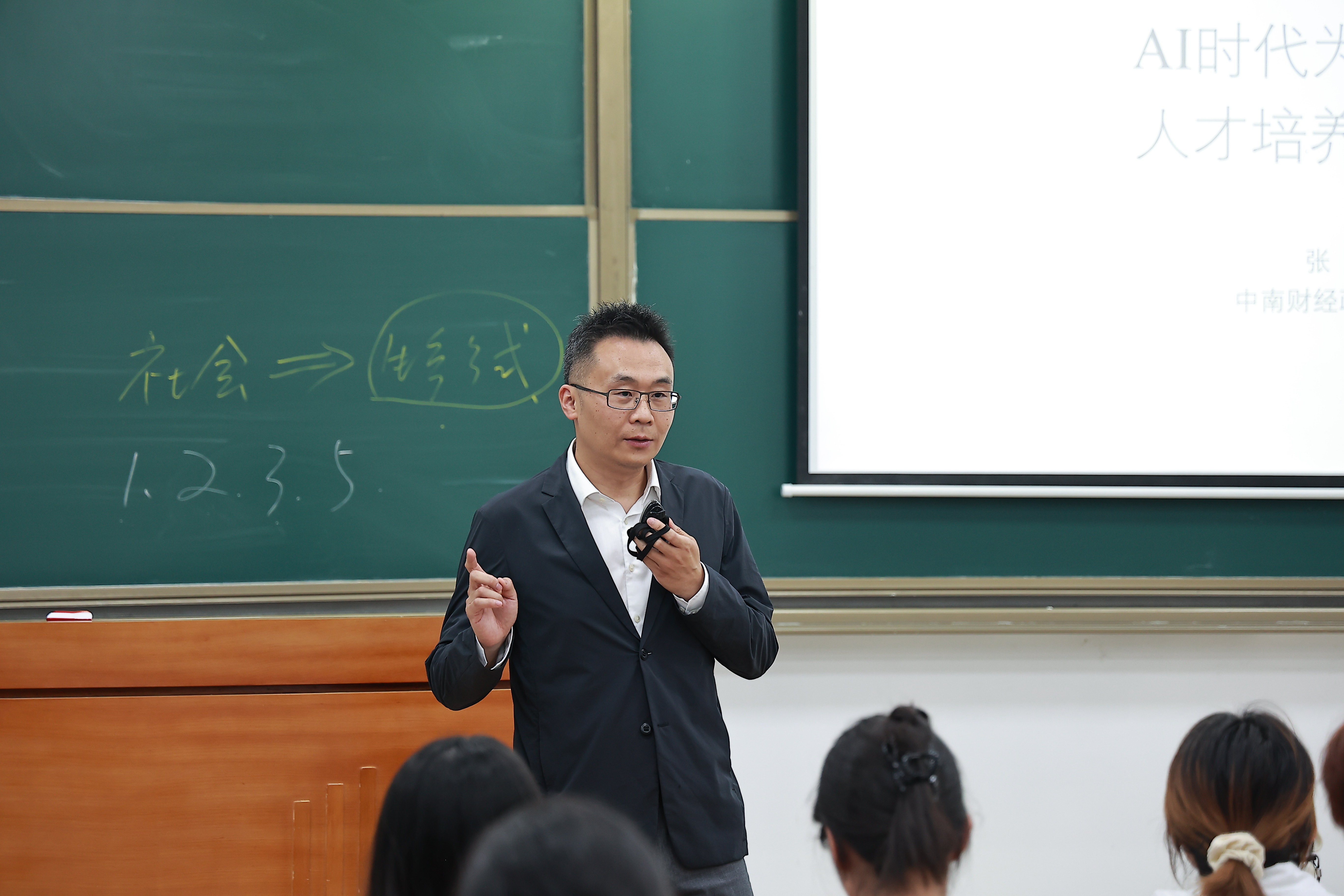 (通讯员张学鹏 摄影崔桢桢)4月17日晚上,校党委常委、副校长张琦教授在文泰楼103教室,为会计2503班、会计2504班、数经(实验)2501班学生讲授题为“AI时代为国理财人才培养”的思政课。张琦从AI时代引起的人才培养变革谈起,系统分析了AI为会计人才培养带来的机遇挑战,创造的条件、环境变化,以及AI时代如何培养人才,。马克思主义学院教师现场听课。