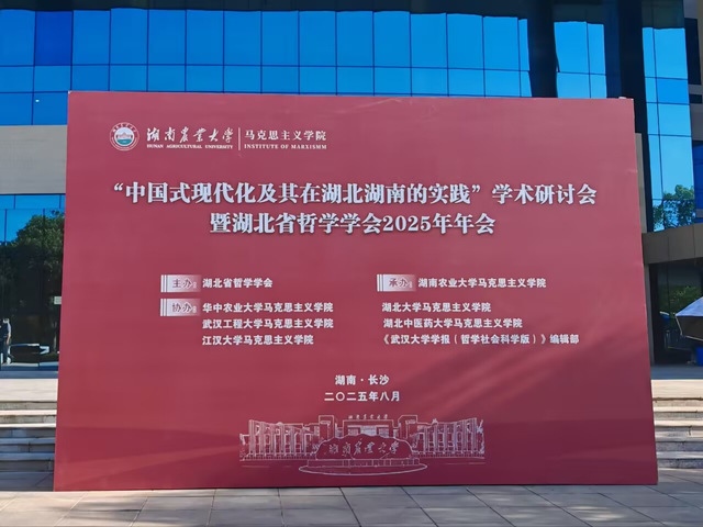 (通讯员 周雨欣)2025年8月27日,“中国式现代化及其在湖北湖南的实践”学术研讨会暨湖北省哲学学会2025年年会于湖南农业大学举办,本次会议由湖北省哲学学会主办,湖南农业大学马克思主义学院承办,华中农业大学马克思主义学院、湖北大学马克思主义学院、武汉工程大学马克思主义学院、湖北中医药大学马克思主义学院、江汉大学马克思主义学院、《武汉大学学报(哲学社会科学版)》编辑部协办。来自武汉大学、华中科技大学、武汉理工大学、湖南省社会科学院等二十多所高校、近200名学界学者、教授、研究生齐聚长沙,围绕“中国式现代化及其在湖北湖南的实践”展开了广泛而深刻的讨论。