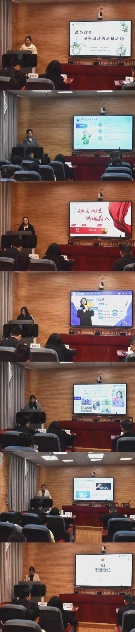 本次展示环节,13位选手紧扣“提升学生求职实战能力与综合素养”这一核心,分别从职业目标契合度、个人发展与市场适应度等维度展开阐述。选手们的演讲题目立意高远、特色鲜明,如《以信念为灯,以思政为魂》《归渝守初心,思政育新人》《愿为灯塔照亮阅读与思辨之路》《融文入理,铸魂育人》等,充分展现了他们扎根不同领域、担当育人使命的职业理想。