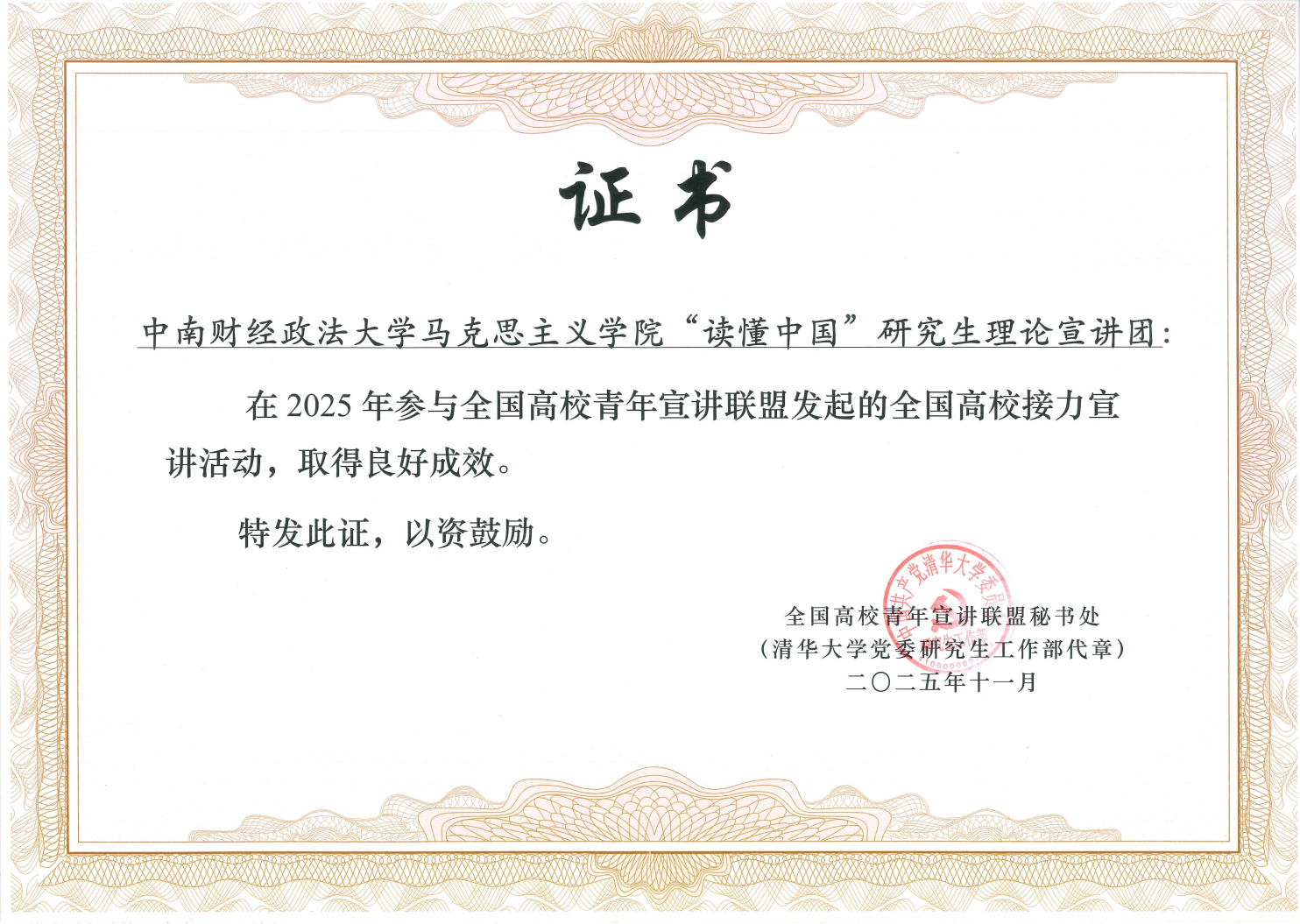 我院“读懂中国”研究生理论宣讲团作为全国高校青年宣讲联盟成员,于今年6月举办读懂中国·理响南湖——全国高校青年接力宣讲暨第十届“立马万言”全国研究生学术论坛分论坛,活动由全国高校青年宣讲联盟发起并指导,中南财经政法大学马克思主义学院承办,采用“联合宣讲+座谈交流”的形式,来自15所高校理论宣讲团代表,以“新质赋能现代化 青年共话新思想”为主题开展联合宣讲研讨。同时,全国高校青年宣讲联盟于今年9月份发起“八秩回响·青言新声”全国高校接力宣讲活动,联动全国各地区高校接力开展“伟大抗战精神”主题宣讲活动,经过申请,我团成为全国12所承办单位之一。以上事迹充分彰显了我团作为联盟成员的责任与担当,此次受邀领奖也是全国高校青年宣讲联盟对我团工作的高度肯定,是我院研究生培养的重要成果体现。