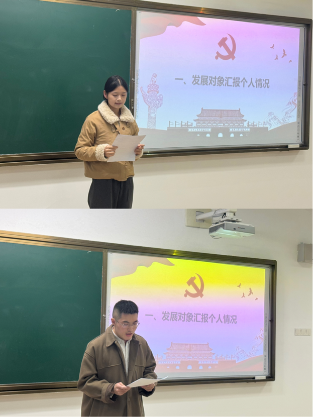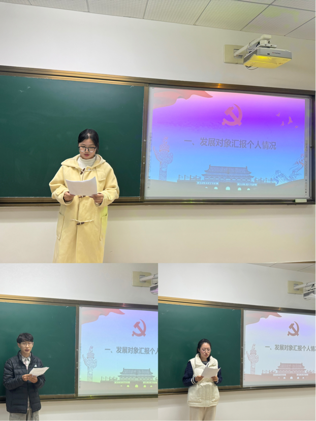 李孟微、白继坤、田秘、王婧琦、梁犇5位发展对象汇报了自己对党的认识、入党动机、本人履历和主要社会关系情况等需要向党组织说明的问题。