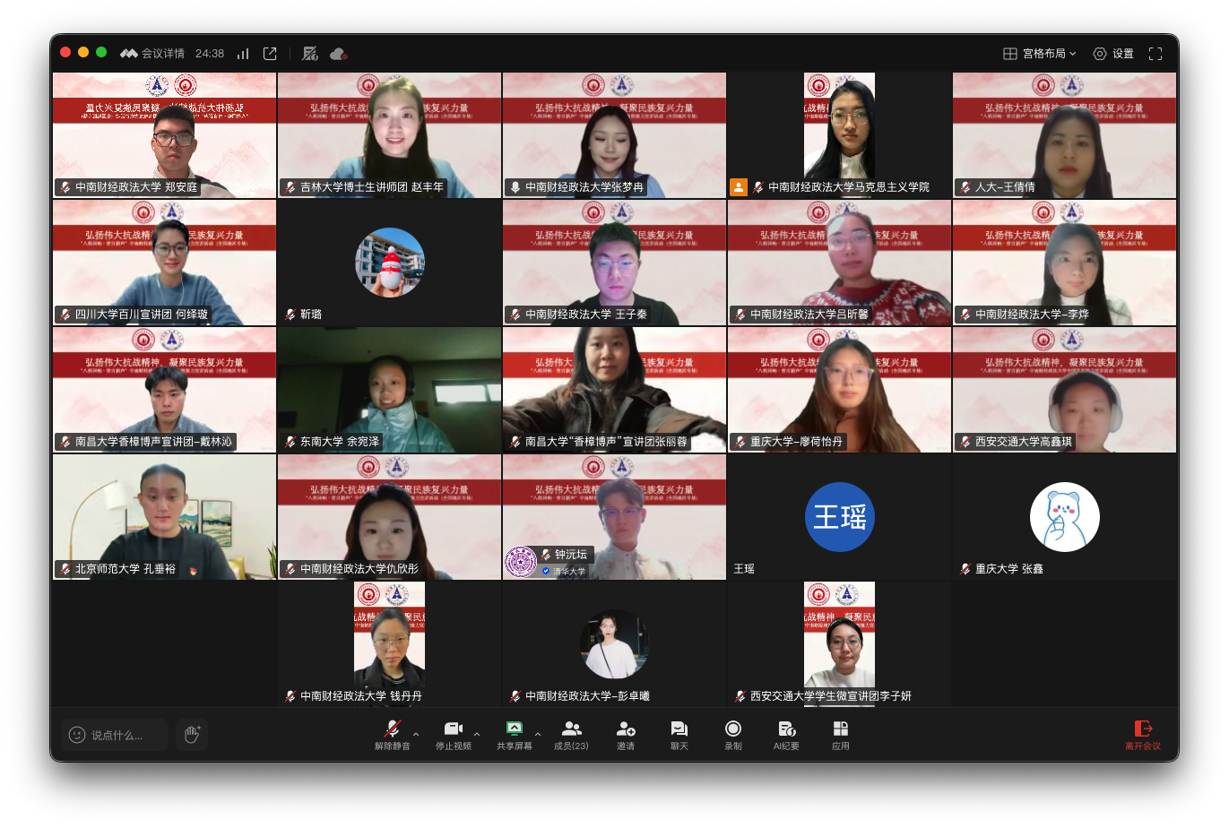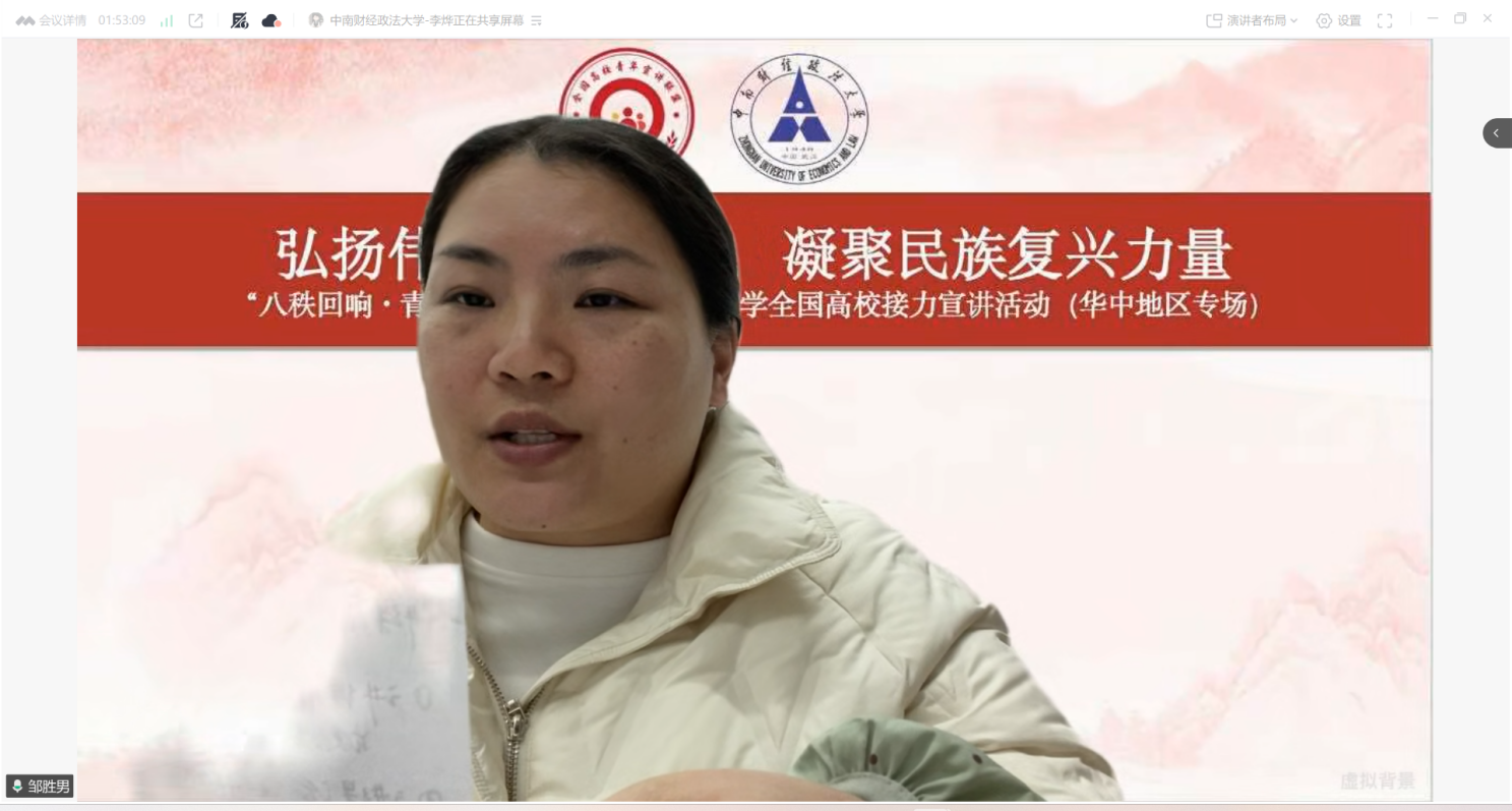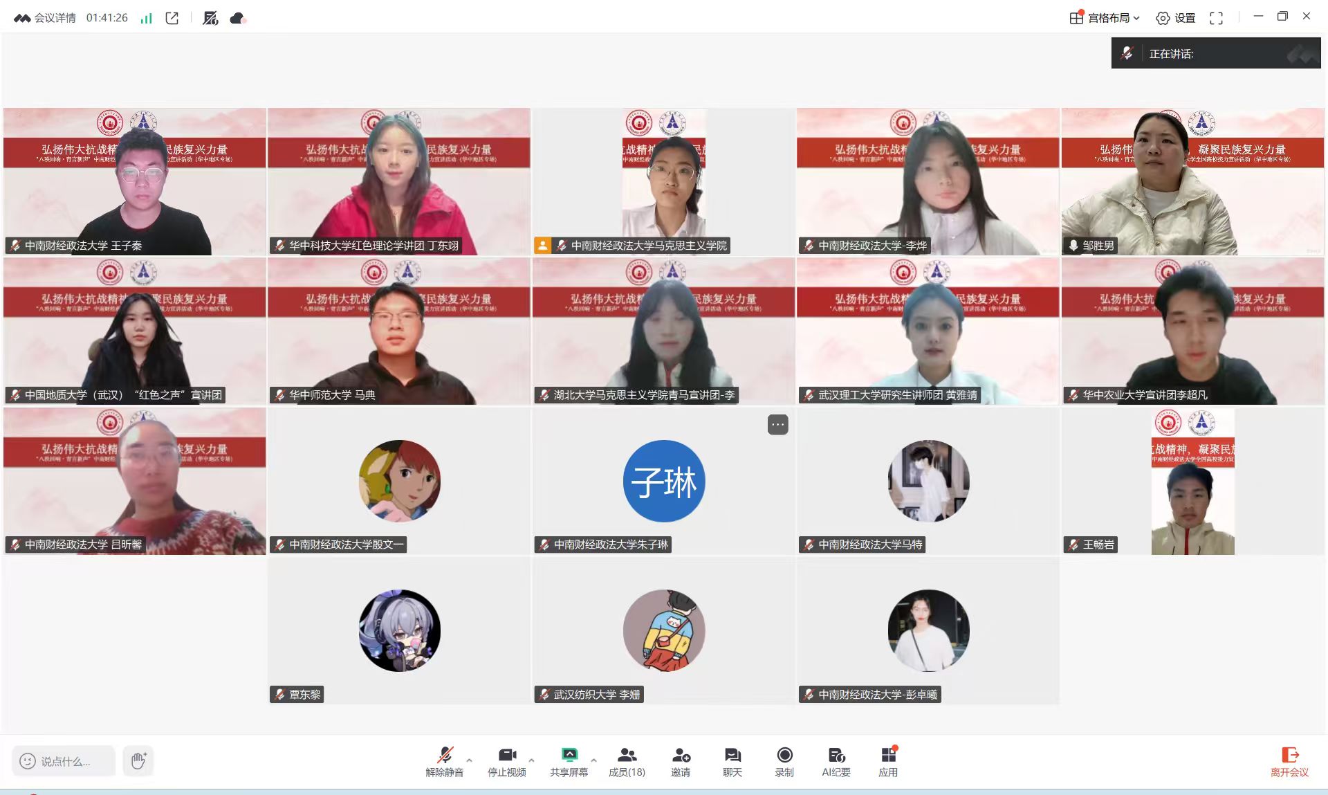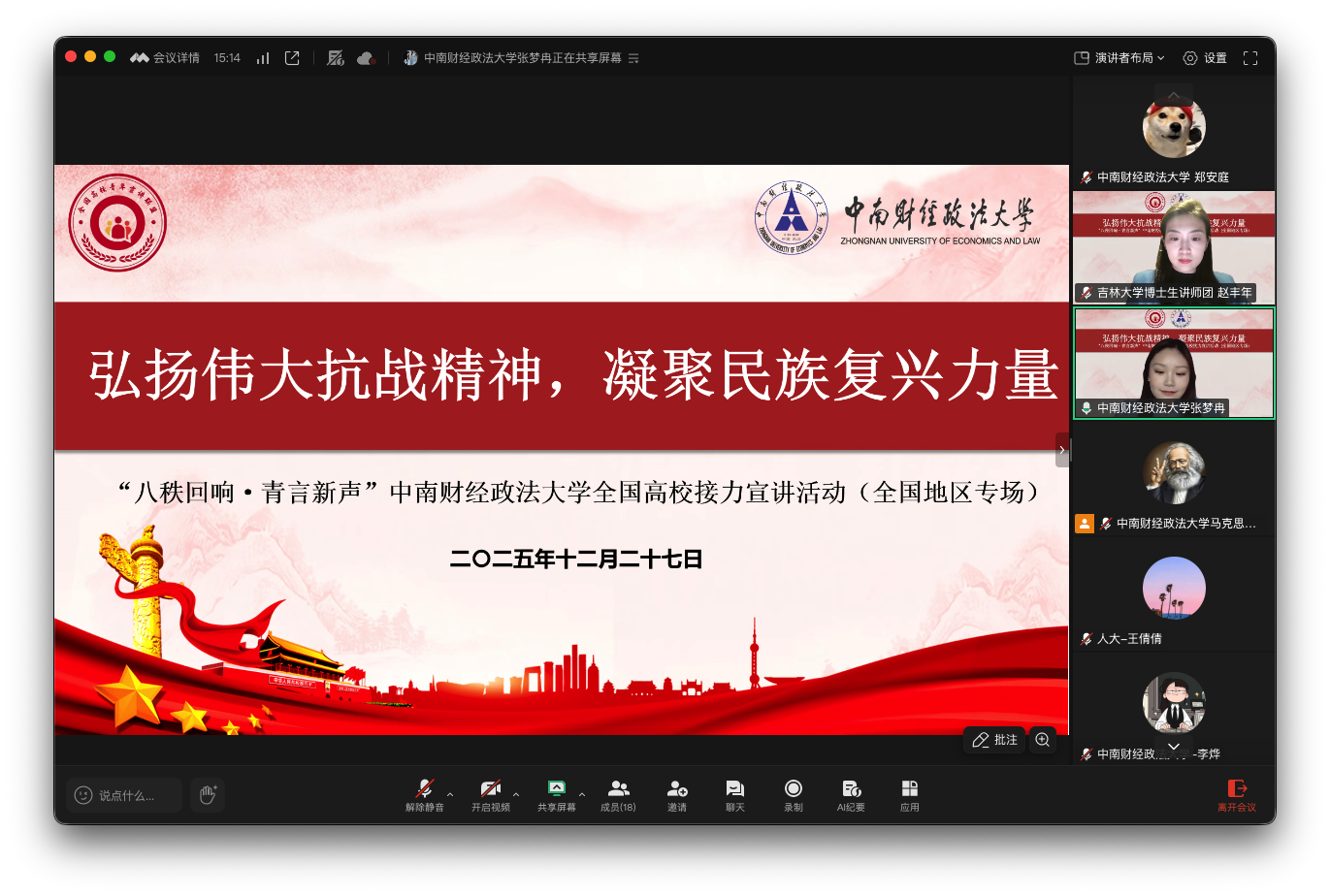 (通讯员 马特 摄影 殷文一 郑安庭)2025年是中国人民抗日战争暨世界反法西斯战争胜利80周年,12月26日-27日,“弘扬伟大抗战精神,凝聚民族复兴力量”全国高校接力宣讲活动在腾讯会议线上举办。本次宣讲活动由全国高校青年宣讲联盟发起并指导,中南财经政法大学马克思主义学院承办,分华中地区专场和全国地区专场先后进行。来自北京大学、中国人民大学、清华大学、吉林大学、东南大学、山东大学、西安交通大学、武汉大学、华中科技大学、中南财经政法大学等20所高校理论宣讲团代表,围绕抗战精神的传承开展联合宣讲。