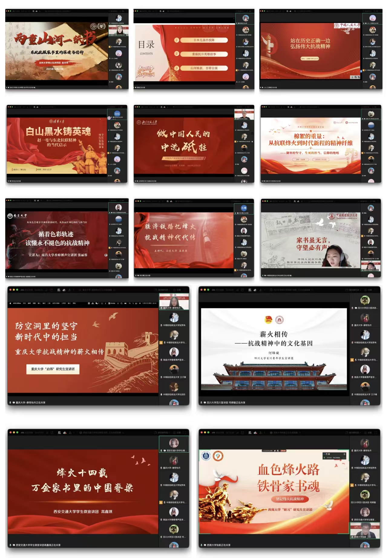 吉林大学赵丰年以《两重山河一纸书》为题,讲述了东北抗联将士的家书,重点提到了魏拯民、赵一曼等抗联英雄的家书内容,展现了他们在极端环境下的坚定信仰以及他们的爱国情怀与牺牲精神;北京大学靳璐以《弘扬抗战精神 挺膺青年担当》为题,回顾了抗日战争的胜利历程及英雄故事,强调了杨靖宇、赵尚志等英雄的牺牲精神,以及抗战精神在新时代的传承意义;中国人民大学王倩倩以《站在历史正确一边,弘扬伟大抗战精神》为题,探讨了抗战精神的理论基础与时代内涵,强调了抗战精神的核心内容:爱国情怀、民族气节、英雄气概和必胜信念;清华大学钟沅坛以《白山黑水铸英魂:赵一曼与东北抗联精神的当代启示》为题,讲述了赵一曼与东北抗联精神的当代启示,通过赵一曼的家书和牺牲事迹,展现了抗战精神的深刻内涵及其对当代青年的激励作用;北京师范大学孔垂裕以《“做中国人民的中流砥柱”--中国共产党在抗日战争中的地位与作用》为题,分析了中国共产党在抗日战争中的地位与作用,通过敌后战场的案例,展示了中国共产党在抗战中的战略贡献与理论创新;东南大学余宛泽以《棉絮的重量:从抗联烽火到时代新程的精神纤维 ——御寒的坚守、生死的担当、信仰的绝唱》为题,通过抗联战士的御寒衣物,展现了他们的坚守与信仰,重点讲述了裴成春、耿殿军等抗联战士的故事,强调了抗战精神在新时代的传承价值;南昌大学张丽蓉以《循着色彩轨迹,读懂永不褪色的抗战精神》为题,通过色彩对比展现了抗战历史的深刻记忆,通过姚明达教授的故事,强调了抗战精神中的爱国情怀与民族气节;山东大学宋乐骞以《胶济铁路忆烽火 抗战精神代代传》为题,通过胶济铁路的历史,展现了抗战精神的传承,重点讲述了胶济铁路沿线抗日英雄的故事,强调了抗战精神在新时代的实践意义;中南财经政法大学仇欣彤以《家书无言守望有声》为题,通过苏联援华飞行员舒斯特尔的家书,展现了中俄友谊与抗战精神,强调了家书作为历史见证的重要性,以及抗战精神在国际合作中的现实意义;重庆大学廖荷怡丹以《防空洞里的坚守,新时代中的担当:重庆大学抗战精神的薪火相传》为题,讲述了重庆大学在抗战中的坚守与贡献,通过讲述防空洞的历史,展现了抗战时期重庆大学师生的爱国精神与学术坚守;四川大学何绎璇以《薪火相传——抗战精神中的文化基因》为题,探讨了抗战精神的文化根源与当代传承,通过江姐等英雄的故事,强调了抗战精神在青年一代中的传承与实践;西安交通大学高鑫琪以《烽火十四载:万金家书里的中国脊梁》为题,通过抗战家书展现了民族精神的力量,重点讲述了谢晋元、吉鸿昌等英雄的家书内容,强调了抗战精神的历史价值与当代意义;西南大学张航以《血色烽火路,铁骨家书魂》为题,通过丁寿康的家书,展现了抗战精神的深刻内涵,强调了抗战精神中的爱国情怀、民族气节、英雄气概和必胜信念。