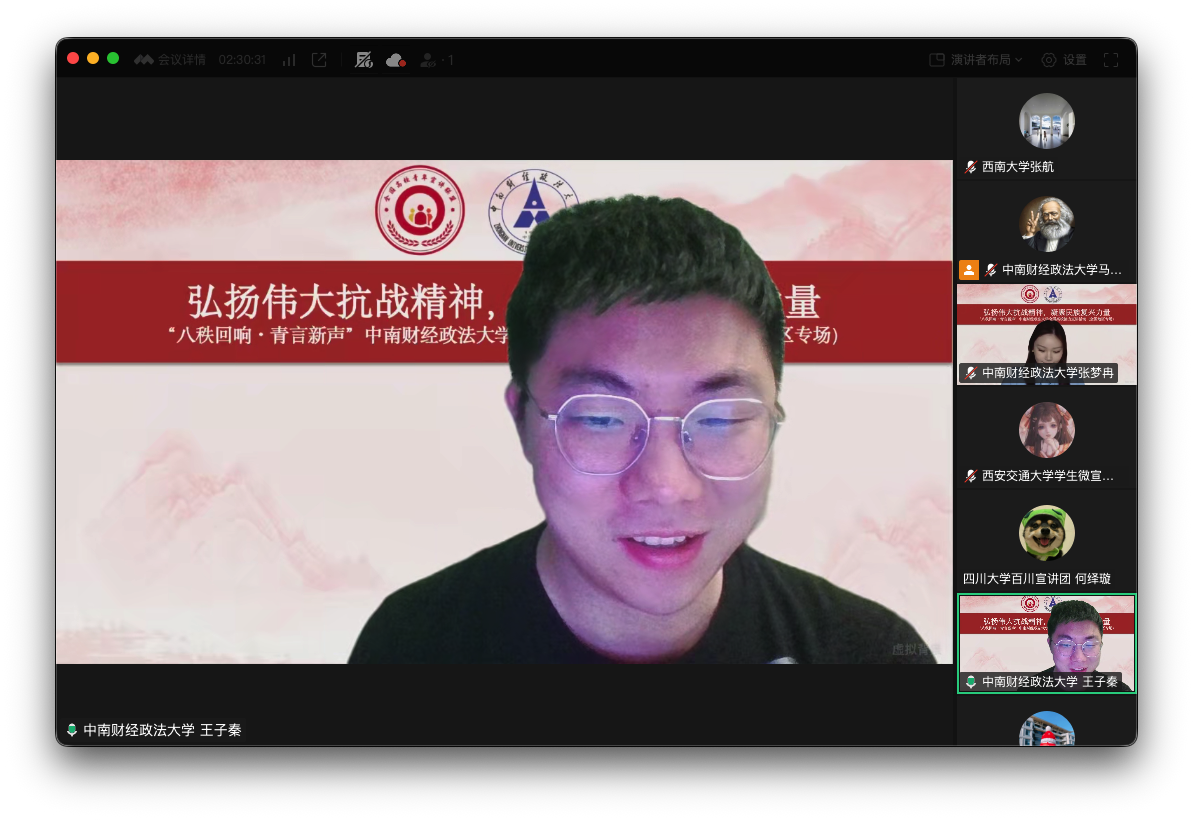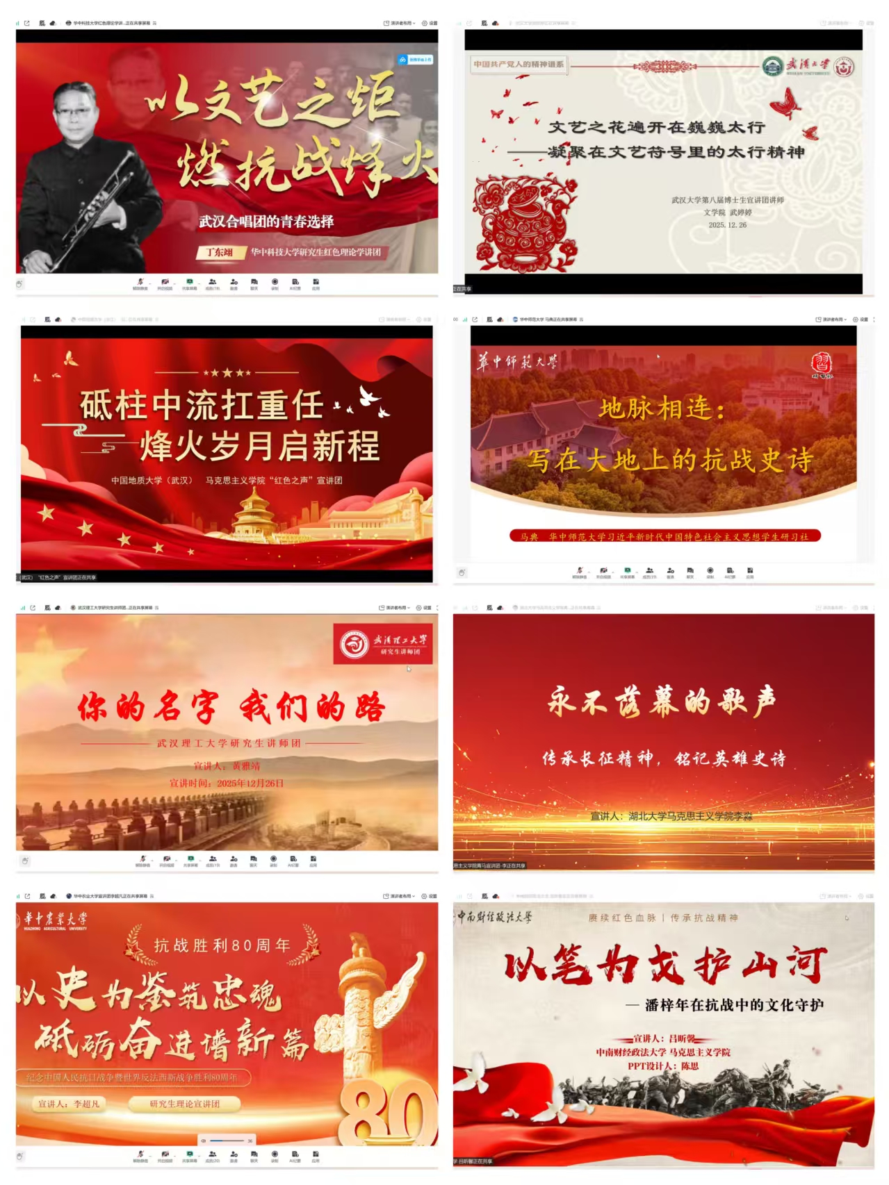 华中科技大学丁东翊以《文艺之炬,燃抗战烽火—武汉合唱团的青春选择》为题,指出武汉合唱团的历史背景、南洋巡演,以及音乐在抗战中的作用和新时代下的中国精神;中国地质大学(武汉)杨子怡以《砥柱中流扛重任,烽火岁月启新程——中国共产党在全民族抗战中的伟大作用》为题,通过中国人民抗日战争的历史回顾以及中国共产党在抗战中的贡献,告诉我们要铭记抗战历史,维护和平;武汉理工大学黄雅靖以《你的名字 我们的路》为题,通过讲述赵一曼的传奇人生、陈怀民的英勇事迹以及杨靖宇的传奇故事,引出英雄名字与地名的传承;华中农业大学李超凡以《以史为鉴铸忠魂,砥砺奋进谱新篇》为题,号召我们以史为鉴,铸忠魂,新时代的青年应担当责任以及提出了青年行动的具体要求;武汉大学武婷婷以《文艺之花遍开在巍巍太行——凝聚在文艺符号里的太行精神》为题,将太行精神的定义与内涵、文艺的发展历程,太行精神的文艺作品体现以及太行精神的时代意义作为内容,让我们更深刻地领悟了太行精神;华中师范大学马典以《地脉相连:写在大地上的抗战史诗》为题,通过地道战的历史背景与初期发展、战术演变与防御体系,以及地道战的战略反攻与成果和对当代的启示,让我们对抗日战争中的地道战有了更清晰的认知;湖北大学李淼以《永不落幕的歌声》为题,永不落幕的歌声传承长征精神,铭记英雄史诗;中南财经政法大学吕昕馨以《以笔为戈护山河:潘梓年在抗战中的文化守护》为题,讲述了我校第二任校长潘梓年先生在绝境中筑报、主持新华日报的创办和坚守、文化领导权与统一战线工作以及传承潘子年先生的精神为内容对潘子年先生抗日的贡献做了系统论述。