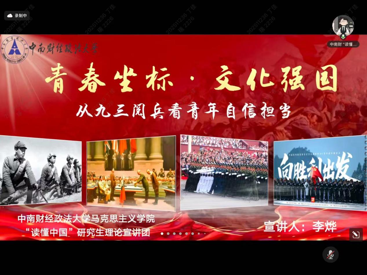 在第二期活动中,李烨以《青春坐标与文化强国:从九三阅兵看青年的自信担当》为题作宣讲分享。她以九三阅兵为切入点,围绕青年与文化自信展开论述,从守历史根脉、强创新底气、践日常行动三个维度,阐释了青年守护历史根脉、以创新为传统文化焕新、在日常中践行文化自信的重要意义。宣讲中,她深度解读了九三阅兵中蕴含的文化自信三重真谛,并发起了“三个一”行动倡议,呼吁广大青年以青春之力扛起文化传承、创新与践行的时代责任,筑牢文化强国建设根基,为民族复兴伟业添砖加瓦。