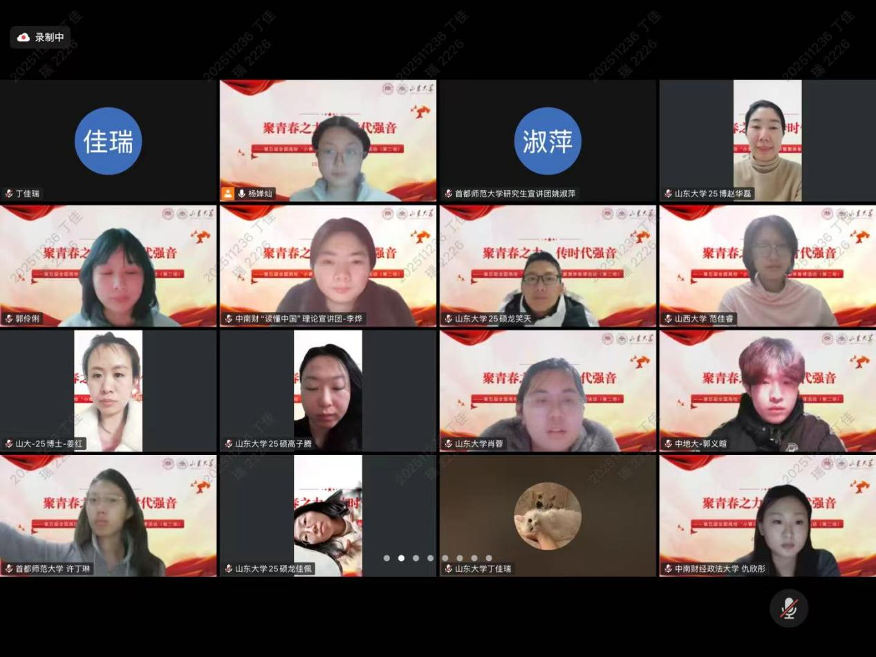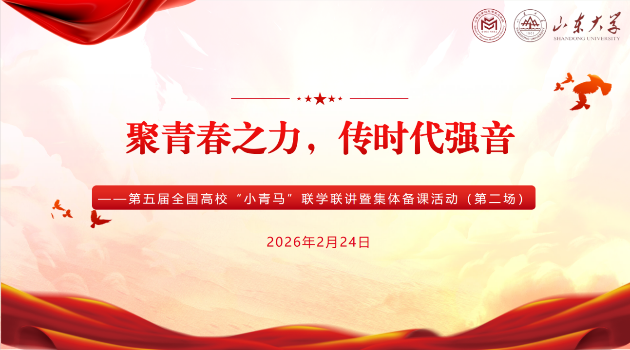 (通讯员 仇欣彤 李烨)为深入学习贯彻党的二十大和二十届四中全会精神,赓续红色血脉、传承红色基因,做好中国式现代化理论的青年化阐释,推动党的创新理论在青年群体中入脑入心、见行见效,2026年2月22日至26日,由山东大学马克思主义学院主办,山东大学习近平新时代中国特色社会主义思想青年学习会、山东大学“青马弘道”理论宣讲团联合承办的第五届全国高校“小青马”联学联讲暨集体备课活动,以线上形式分三期顺利开展。